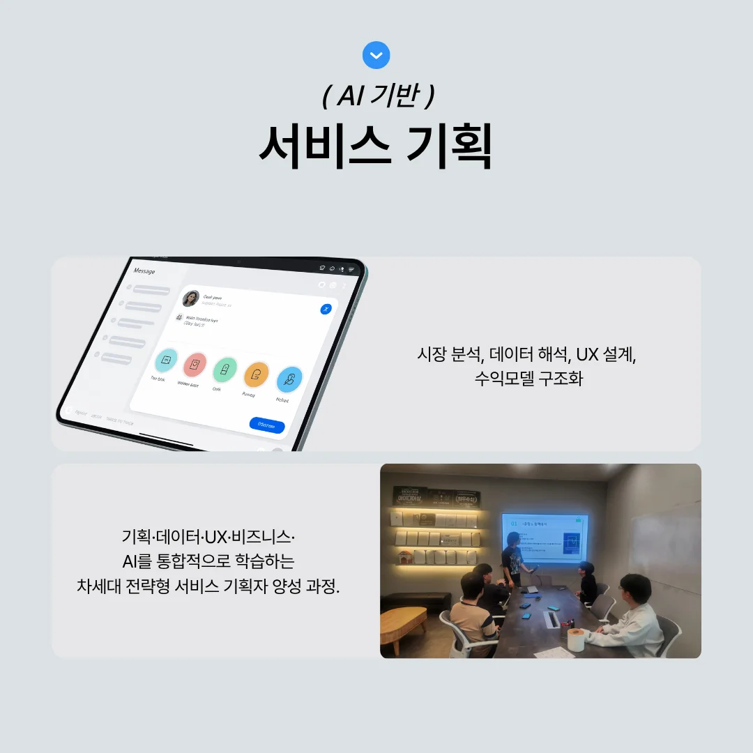 교육 과정에서 프로젝트를 완성하고, 그 결과물을 기반으로 포트폴리오를 확보한 뒤, 인턴십을 통해 실제 현업 경험을 쌓고, 이후 정규직 전환까지 이어지는 구조를 갖추고 있습니다. 즉, 서비스 기획자로 커리어를 시작하기 위한 전 과정을 한 번에 경험할 수 있는 흐름이라고 보시면 됩니다.