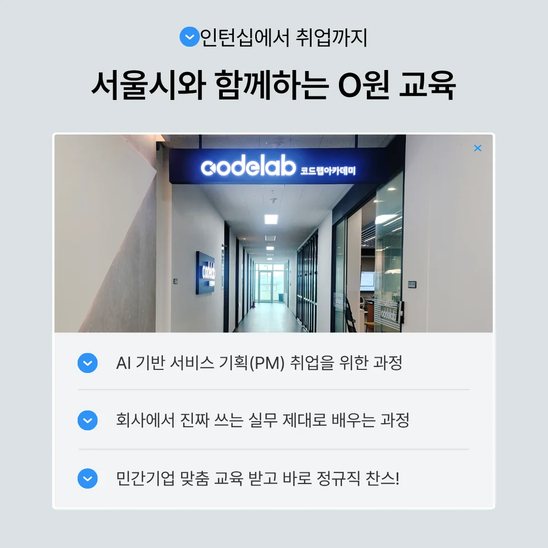 코드랩 아카데미에서는 이러한 흐름에 맞춰 AI 무료 교육을 커리큘럼의 핵심으로 구성했습니다. 교육 뿐 아니라 취업까지 연결된다는 점이 특징입니다.