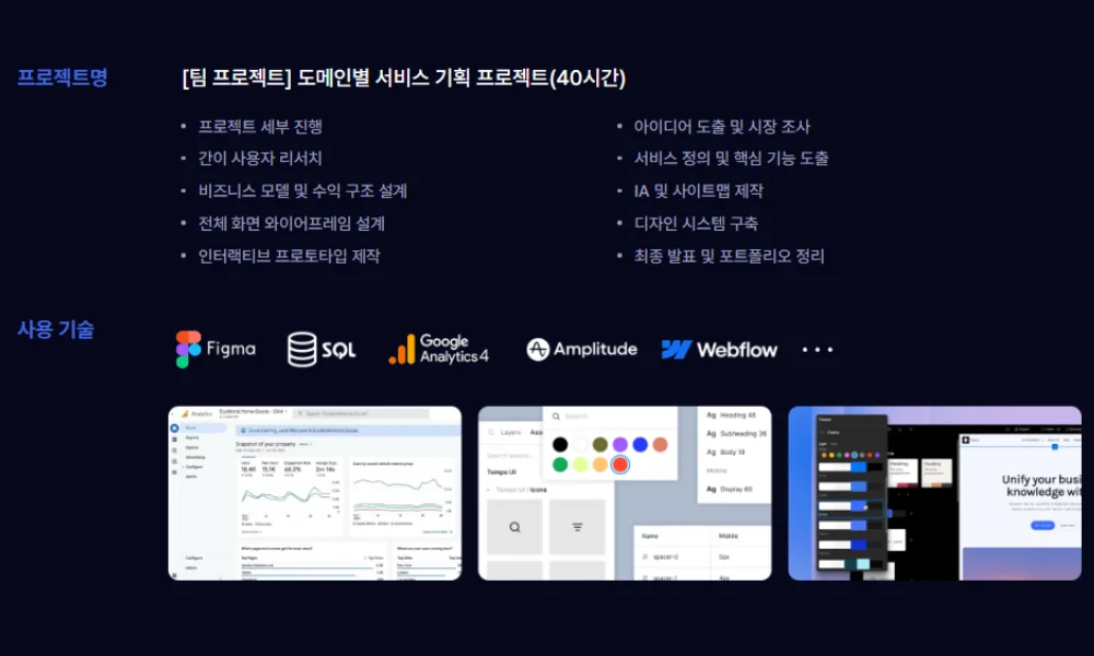 아이디어 도출과 시장 조사에서 시작해 간이 사용자 리서치, 비즈니스 모델 및 수익 구조 설계, IA 및 사이트맵 제작, 전체 화면 와이어프레임 설계, 디자인 시스템 구축, 인터랙티브 프로토타입 제작까지 실무에서 실제로 진행되는 기획 프로세스를 팀 단위로 경험하게 됩니다. Figma, SQL, GA4, Amplitude, Webflow 등 수업에서 익힌 툴들이 이 프로젝트에서 실제로 활용됩니다.