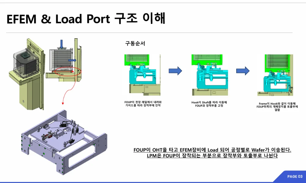 Load Port Module은 웨이퍼가 담긴 운반 용기(FOUP)가 장착되는 입구 역할을 합니다. 공장 천장 레일을 타고 내려온 FOUP이 자동으로 장착 위치에 안착되고, 내부 Hook과 Shaft가 움직이며 고정된 뒤 공정 장비 쪽으로 열립니다. 마치 USB를 꽂을 때 방향과 위치가 정확히 맞아야 연결되는 것처럼, 각 부품의 결합 위치가 조금만 틀어져도 FOUP이 제대로 연결되지 않습니다.