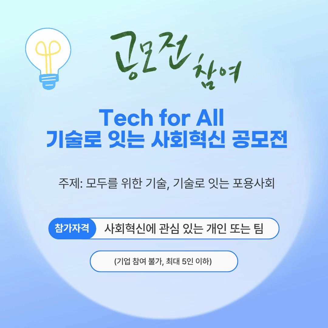Tech for All: 기술로 잇는 사회혁신 공모전은 기술로 세상을 더 따뜻하게 만들고 싶은 분들에게 열려 있습니다.