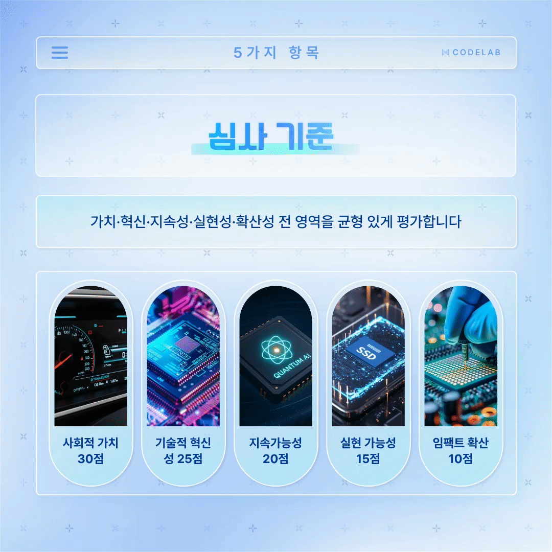 아이디어가 실제로 사회문제 해결에 얼마나 기여할 수 있는지, 또 취약계층을 지원할 수 있는지 평가합니다. 단순한 기술이 아닌 사회적 파급력에 집중합니다.