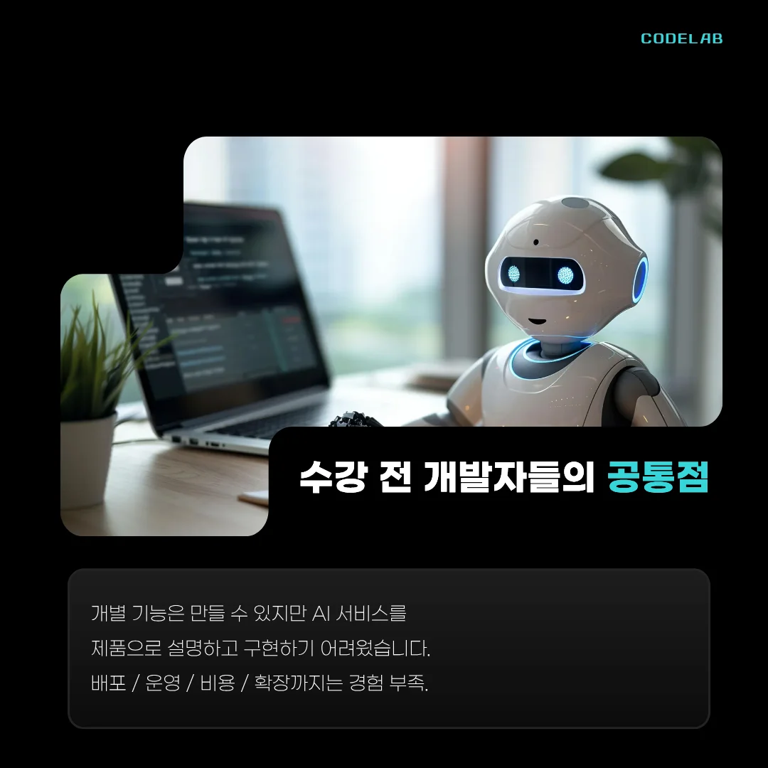 그에 따라 현직 개발자에게 요구되는 역량 역시 분명하게 변화하고 있는데요. 이제는 모델을 호출하고 API를 연결하는 수준을 넘어, AI 서비스를 하나의 제품 관점에서 설계하고 운영할 수 있는 역량이 중요해지고 있습니다.