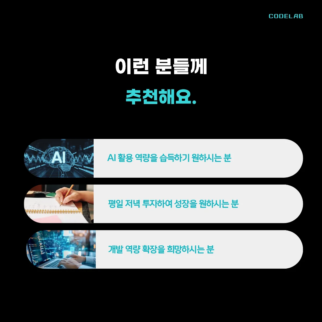 본 과정은 직장인을 대상으로 한 실시간 온라인 국비교육으로, 퇴근 후에도 부담 없이 참여하며 AI 프로젝트를 직접 경험할 수 있도록 구성되어 있습니다.