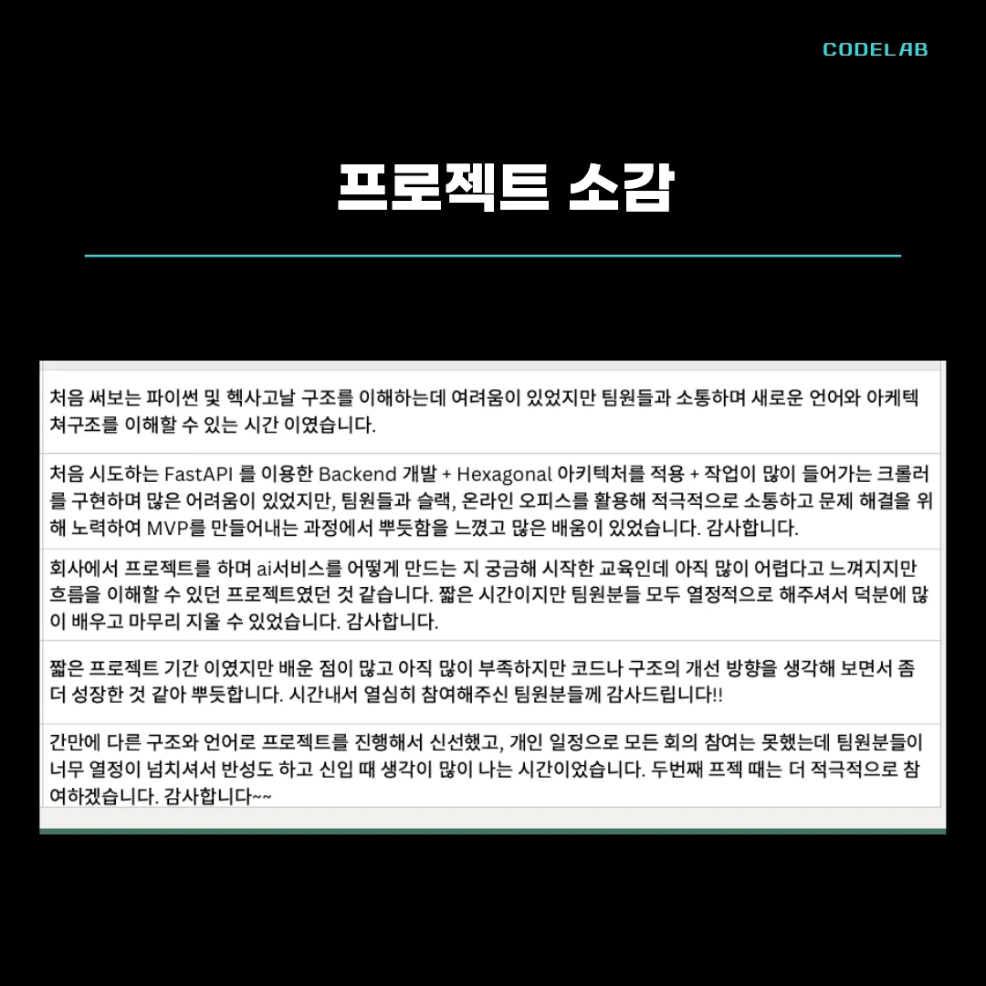 반면 수강 후에는 AI 기능을 단순히 따라 구현하는 수준을 넘어, AI를 서비스 흐름 안에서 어떻게 배치하고, 각 기능이 어떤 역할을 수행해야 하는지를 구조적으로 설명할 수 있게 되었습니다.