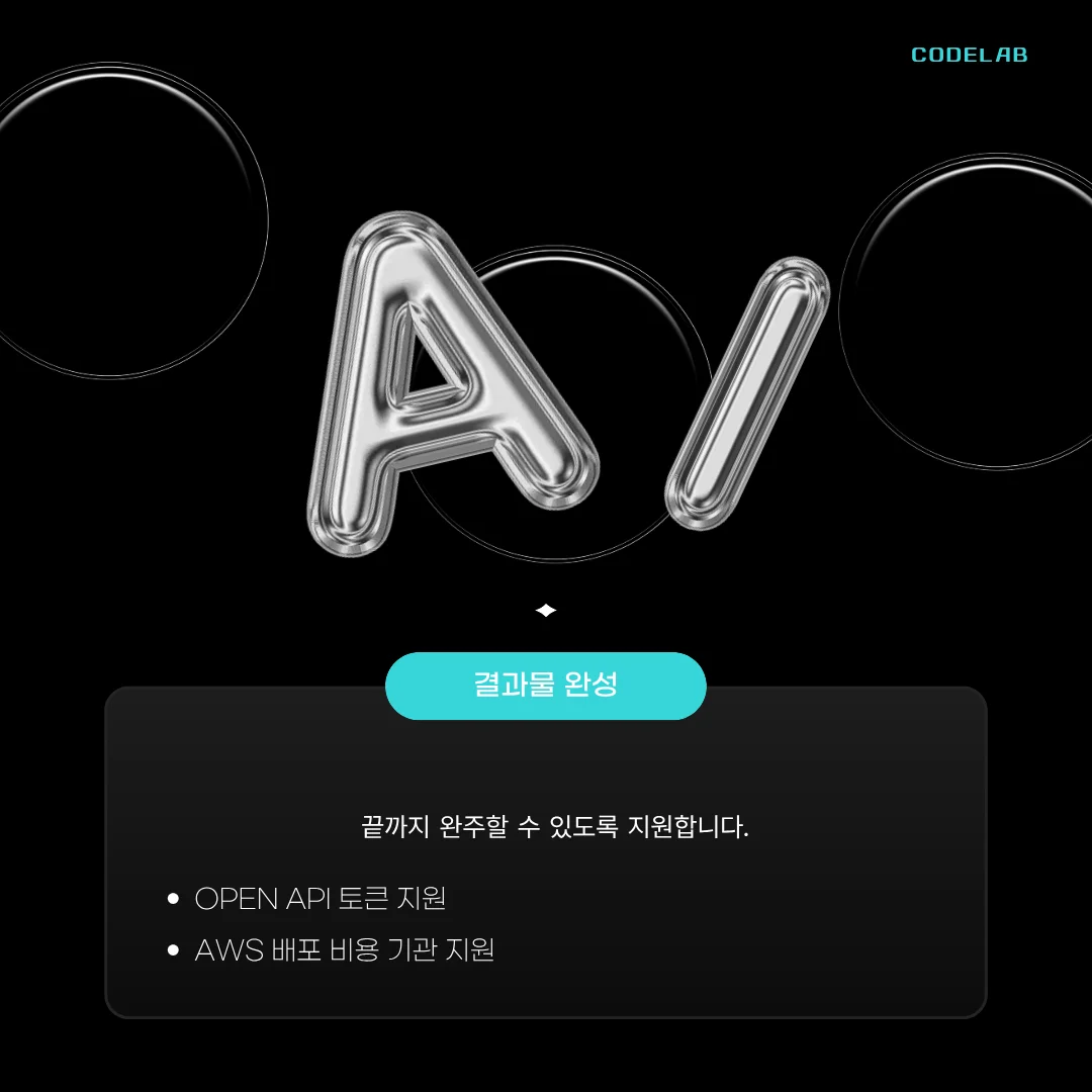 먼저 팀별 프로젝트 진행을 위해 OpenAI API 토큰은 팀당 100달러가 제공되었고, AWS 기반 배포가 필요한 프로젝트의 경우 팀당 약 60만 원 규모의 배포 비용을 저희 기관에서 지원하였습니다.